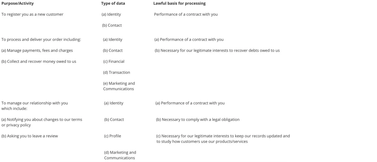 We may process your personal data for more than one lawful ground, depending on the specific purpose for which we are using your data. Please email us at [[email protected]] if you need details about the specific legal ground we are relying on to process your personal data where more than one ground has been set out in the table below.